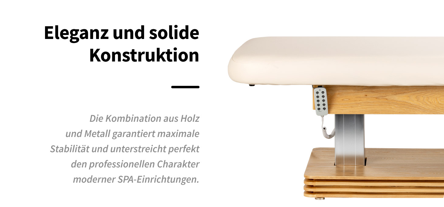 Die moderne Behandlungsliege mit einem soliden Holz-Metall-Untergestell sorgt für maximale Stabilität und Sicherheit bei der Durchführung von Behandlungen. Die robuste Konstruktion garantiert einen sicheren Halt, sodass Kosmetik-, Pflege-, Entspannungs- und Massagebehandlungen unter komfortablen Bedingungen durchgeführt werden können – sowohl für den Kunden als auch für den Fachmann. Sorgfältig ausgearbeitete Details und eine dezente Farbgebung sorgen dafür, dass sich die Kosmetikliege für Massagesalons und Wellnessbereiche perfekt in elegante, professionelle Innenräume einfügt. Die Ästhetik und die solide Verarbeitung sorgen für einen höheren Servicestandard, stärken das Vertrauen der Kunden und steigern den wahrgenommenen Wert der im Salon angebotenen Behandlungen.