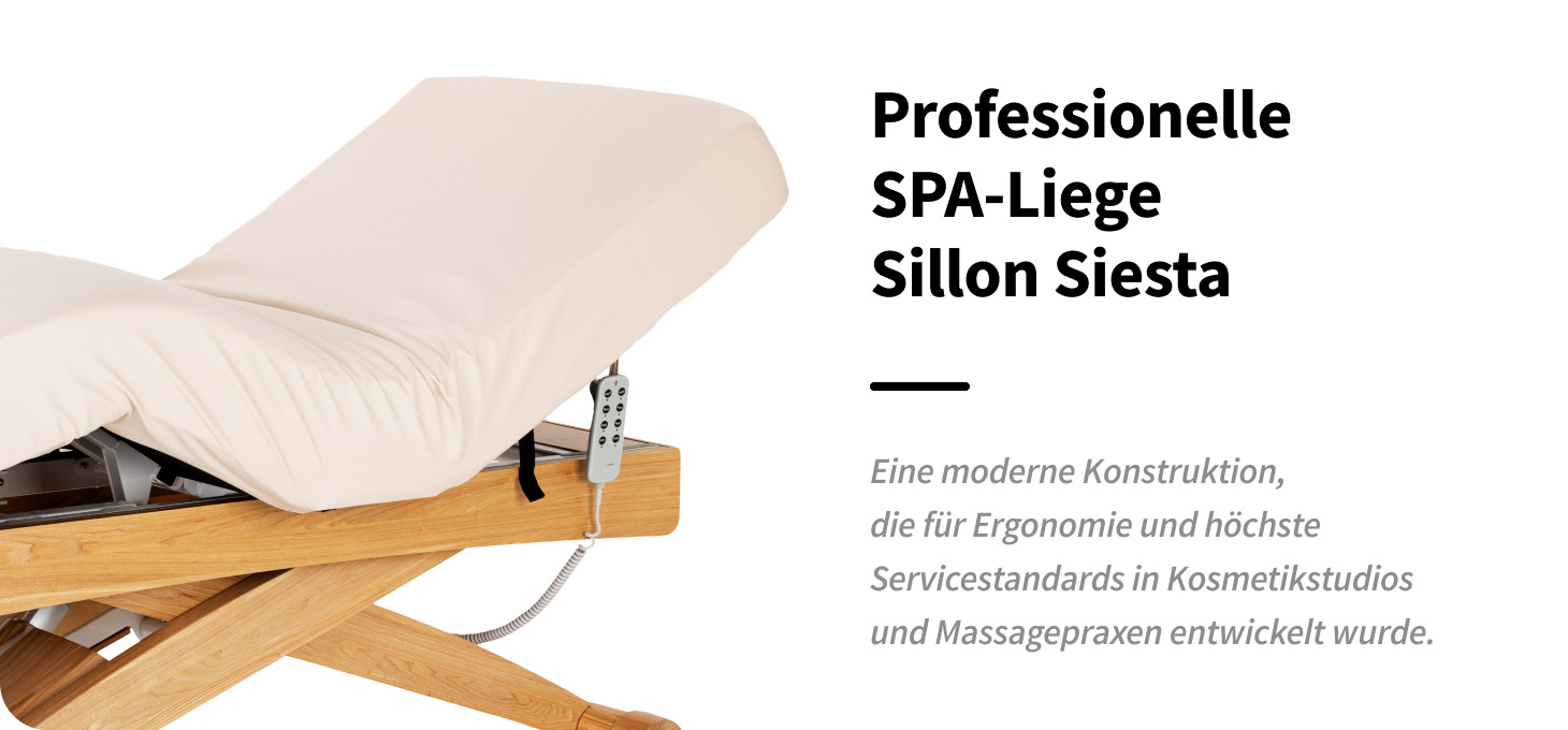 Die SPA-Liege Sillon Siesta wurde speziell für professionelle Kosmetiksalons, Massagesalons und SPA-Bereiche entwickelt. Das Modell verbindet moderne technologische Lösungen mit hohem Bedienkomfort und einer stabilen, langlebigen Konstruktion. Die durchdachte Form und die ausgefeilten Details sorgen für Funktionalität, Ästhetik und Komfort bei der Arbeit und entsprechen den Bedürfnissen von Fachleuten der Beauty-Branche.