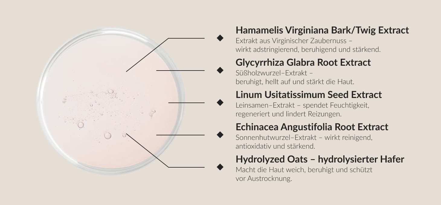 Hamamelextrakt hat eine adstringierende und regenerierende Wirkung und unterstützt die natürlichen Funktionen der Haut. Lakritz und Leinsamen lindern Reizungen, hellen den Teint auf und helfen, eine angemessene Flüssigkeitszufuhr zu erhalten. Echinacea hat eine reinigende und antiradikale Wirkung und stärkt die schützende Hautbarriere.