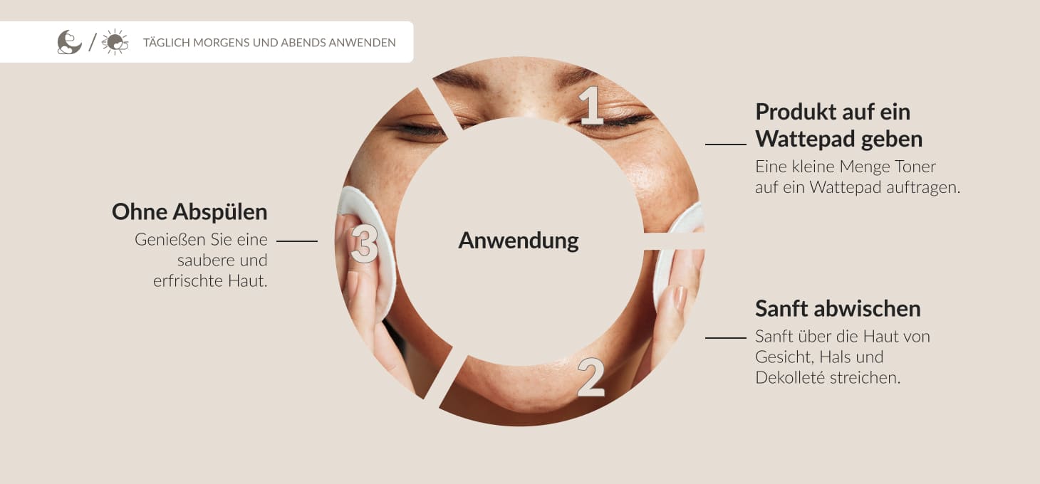Trage eine kleine Menge Toner auf ein Wattepad auf und reibe es vorsichtig über Haut im Gesicht, am Hals und im Dekollet. Verwenden Sie sie jeden Morgen und Abend oder je nach individuellen Hautbedürfnissen.