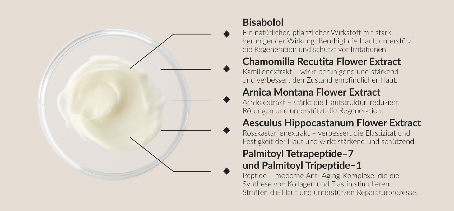 Die Formel der Maske kombiniert die Wirkung natürlicher Pflanzenextrakte mit Peptidkomplexen und Vitamin E. Extrakte aus Bergarnika, Kamille und Pferdekastanie verringern das Erscheinungsbild von Blutgefäßen und unterstützen die Verringerung von Rötungen. Avocadoöl, Panthenol und Bisabolol nähren und beruhigen die Haut intensiv, unterstützen deren Regeneration und Schutz vor äußeren Einflüssen. Der Peptidkomplex unterstützt die Produktion von Kollagen und Elastin und hilft, die Festigkeit und Elastizität der Haut zu erhalten.