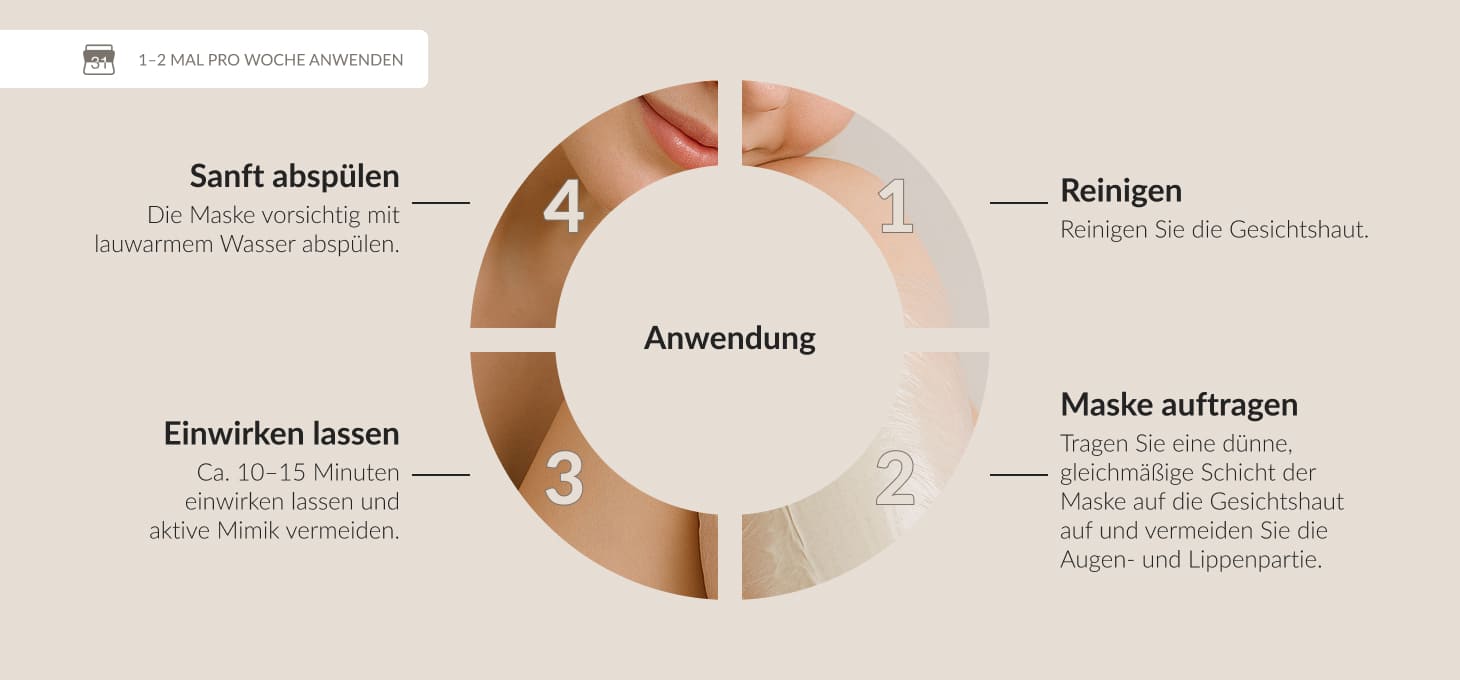 Tragen Sie eine gleichmäßige, dünne Schicht der Maske auf die gereinigte Gesichtshaut auf und vermeiden Sie dabei Augen- und Mundbereich. 10–15 Minuten einwirken lassen und dann mit lauwarmem Wasser abwaschen. Verwenden Sie 1-2 Mal pro Woche oder je nach individuellen Hautbedürfnissen.