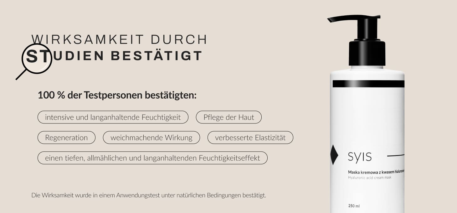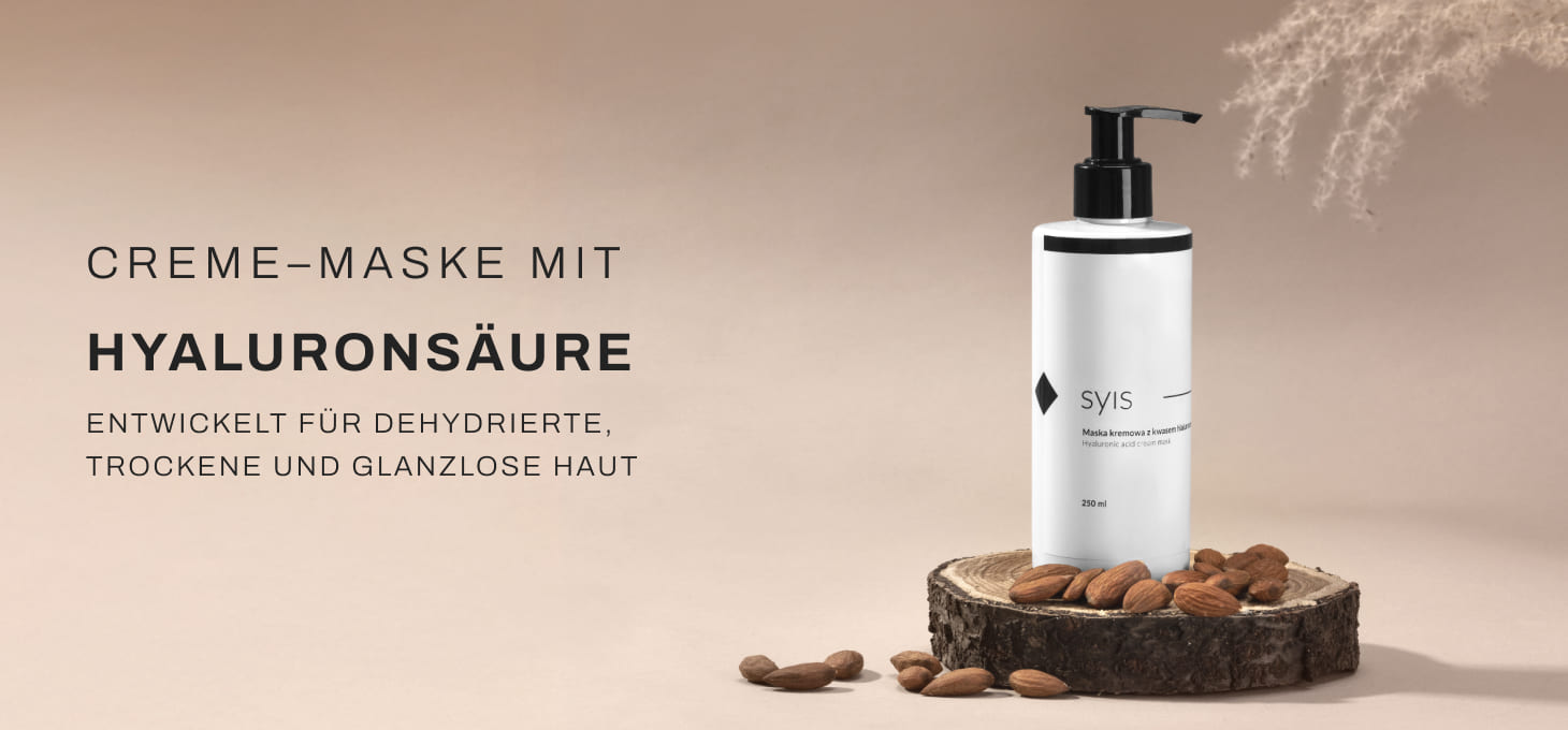 Die Formel der SYIS-Crememaske mit Hyaluronsäure wurde für dehydrierte, trockene und matte Haut entwickelt. Sie ist sowohl für professionelle als auch für die häusliche Pflege ideal – sie spendet intensiv und langanhaltend Feuchtigkeit, stellt die Elastizität wieder her und unterstützt die Regeneration.