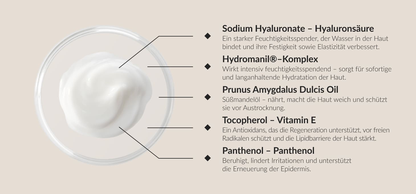 Die Maske kombiniert niedrigmolekulare Hyaluronsäure, die Wasser in den tieferen Hautschichten bindet, mit hochmolekularer Säure, die eine Schutzschicht auf ihrer Oberfläche bildet, um Feuchtigkeitsverlust zu verhindern. Hydromanil®- und Pentavitin-Komplexe® unterstützen eine langanhaltende, mehrstufige Hydratation – sie wirken als "Feuchtigkeitsmagnet", halten Wasser zurück und setzen allmählich Wirkstoffe frei.