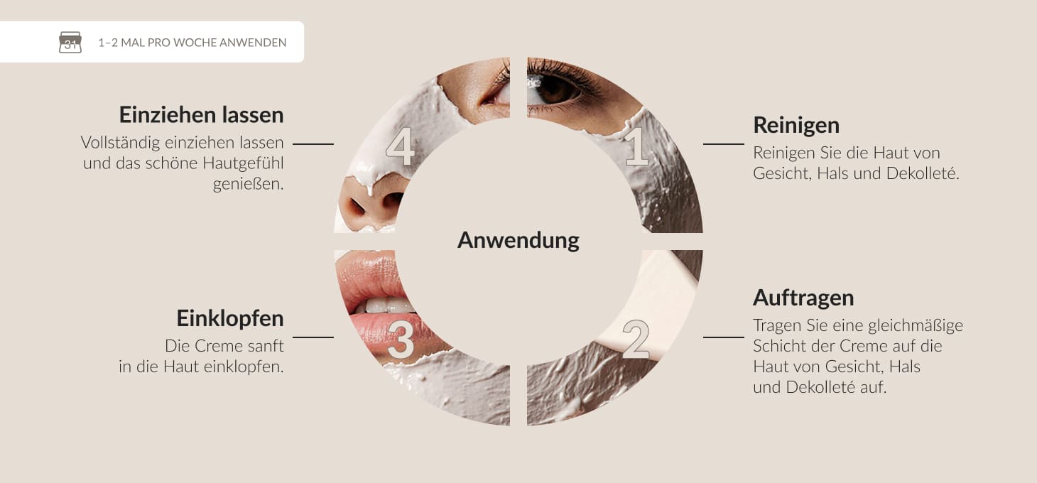 Tragen Sie eine gleichmäßige, dünne Schicht der Maske auf die gereinigte Gesichtshaut auf und vermeiden Sie dabei Augen- und Mundbereich. 10–15 Minuten einwirken lassen und dann mit lauwarmem Wasser abwaschen. Verwenden Sie 1-2 Mal pro Woche oder je nach individuellen Hautbedürfnissen.
