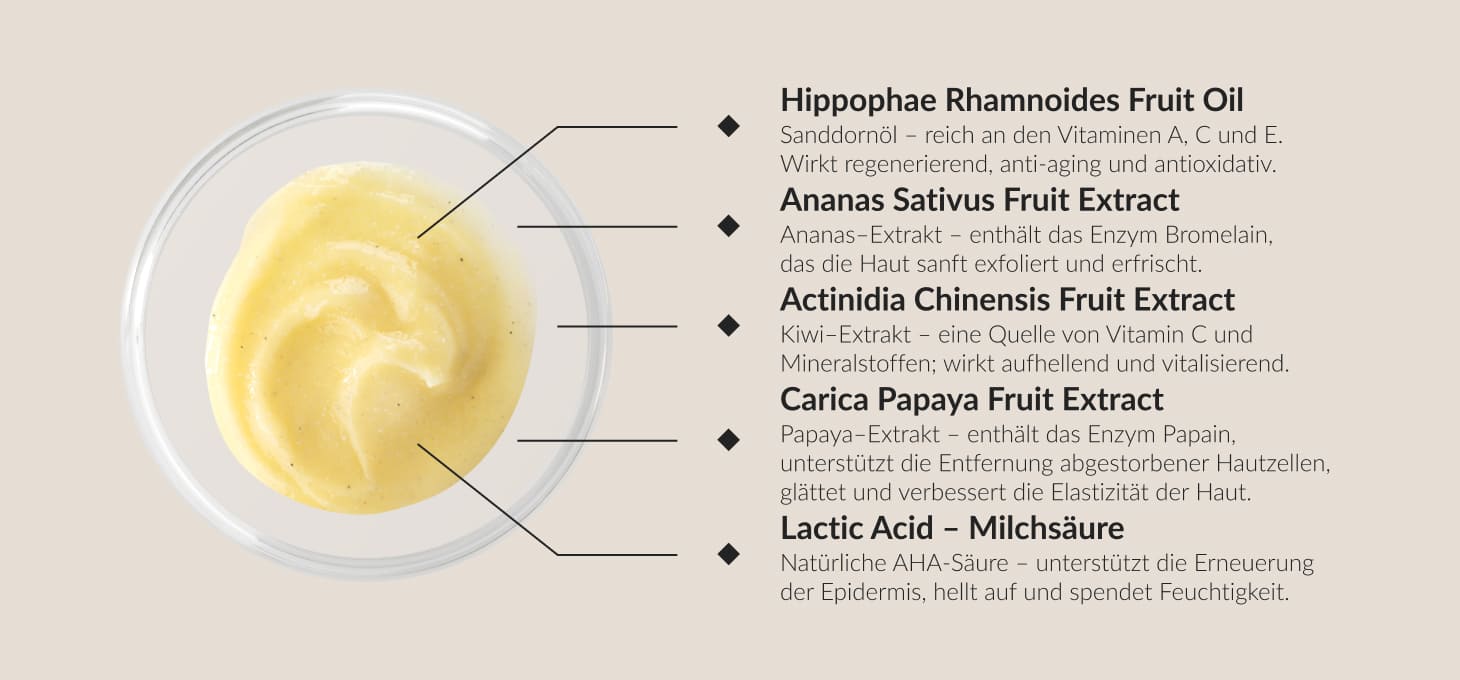 Die fortschrittliche Peeling-Formel verbindet die enzymatische Wirkung von Papaya-, Kiwi- und Ananasextrakten mit Korundpartikeln, die abgestorbene Hautzellen mechanisch entfernen und Poren öffnen. Milchsäure unterstützt zudem den Erneuerungsprozess, hellt die Haut sanft auf und verbessert ihre Struktur, während Himbeerextrakt und Hafdornöl Vitamine und Antioxidantien liefern, die die Haut nähren und regenerieren.
