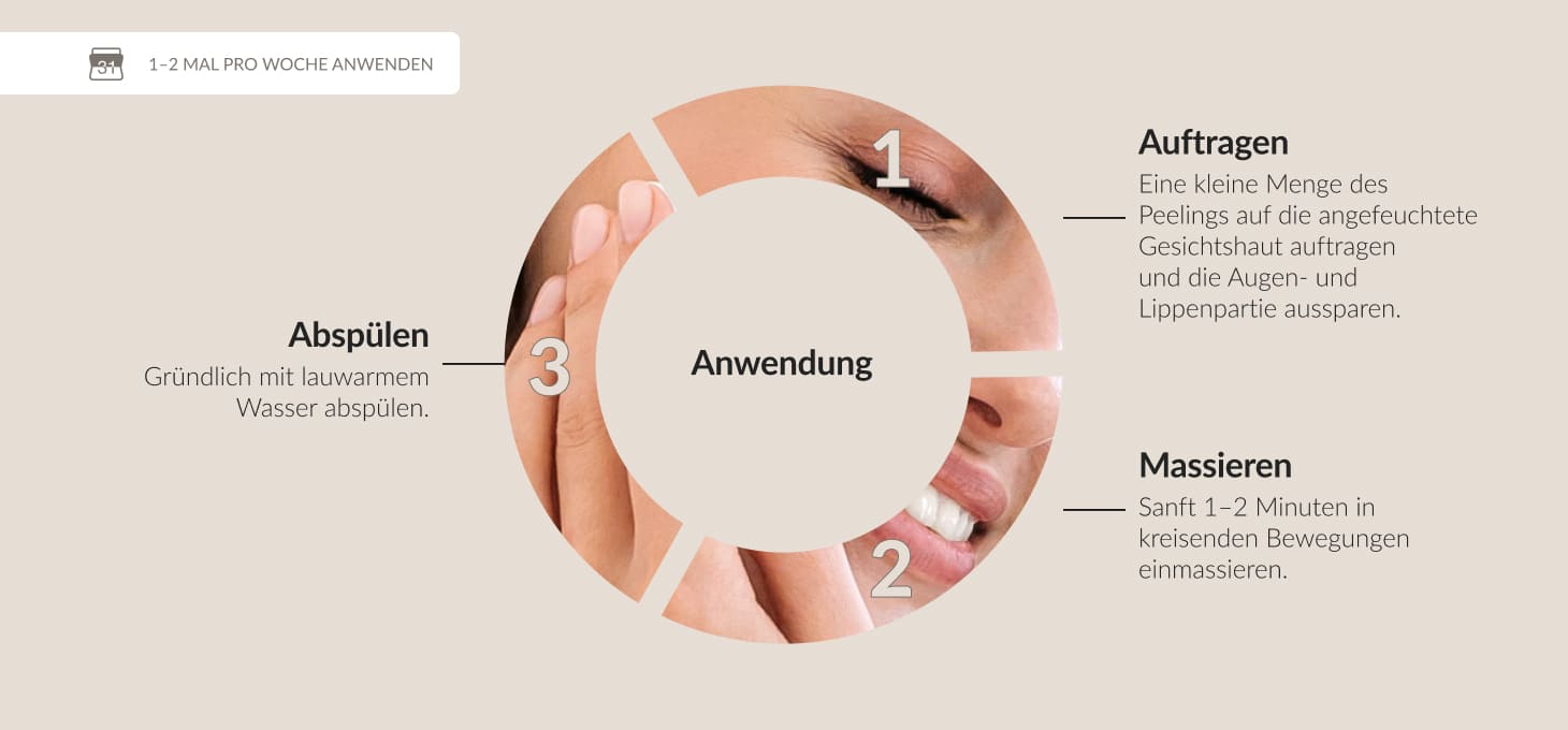 Tragen Sie eine kleine Menge Peeling auf feuchte Gesichtshaut auf und vermeiden Sie den Bereich von Augen und Mund. Massiere vorsichtig in kreisenden Bewegungen 1–2 Minuten lang und spüle dann gründlich mit lauwarmem Wasser ab. Verwenden Sie 1-2 Mal pro Woche oder je nach individuellen Hautbedürfnissen.