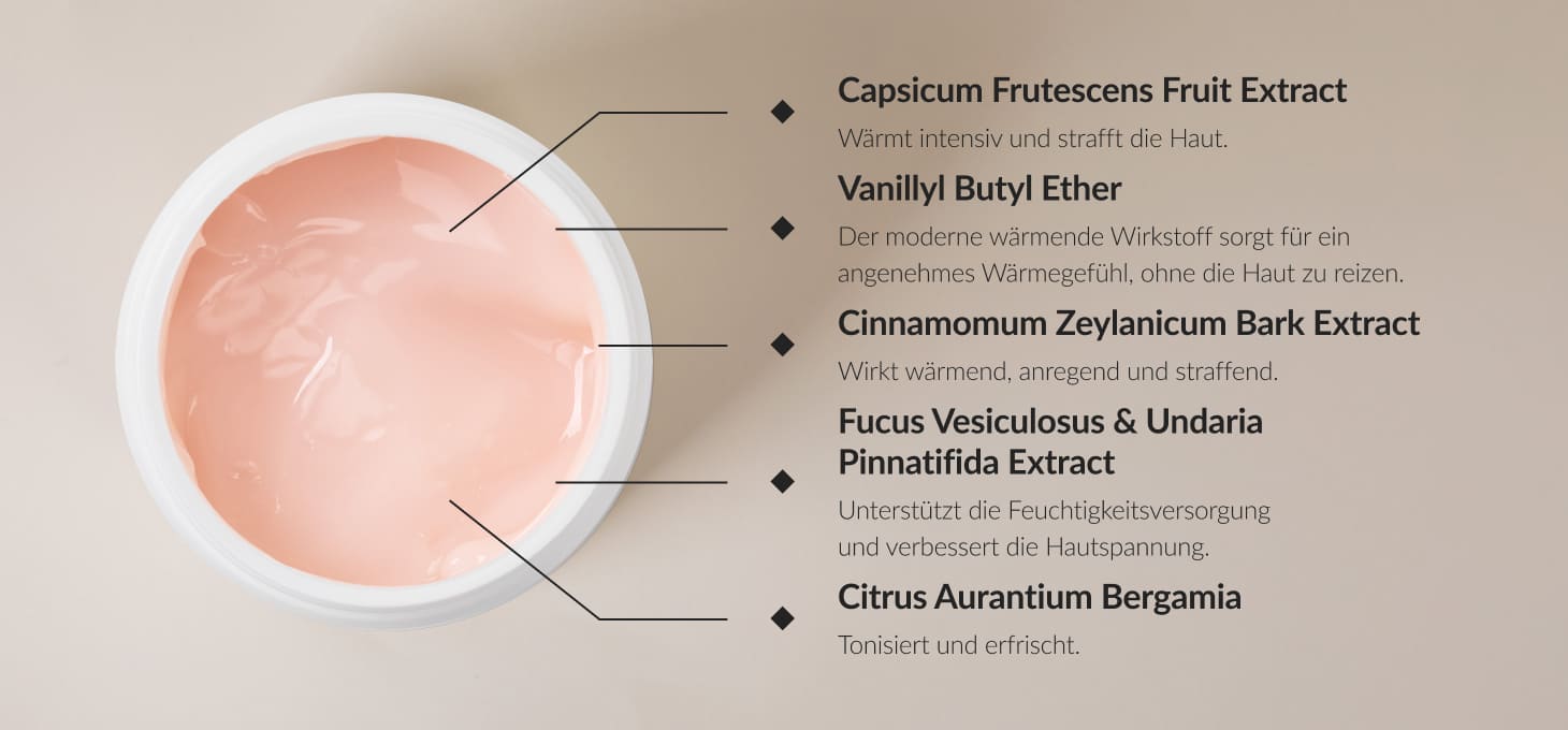 Die Formel der Maske wurde mit Inhaltsstoffen angereichert, die eine stark wärmende und pflegende Wirkung haben und die Straffung und Befeuchtung der Haut unterstützen. Chili-Extrakt wärmt und strafft intensiv, während Vanillylbutylether für ein angenehmes Wärmegefühl ohne Irritationen sorgt. Zimtrindenextrakt wirkt wärmend und stimulierend auf die Haut und unterstützt ihre Spannung, während Algenextrakte Feuchtigkeit spenden und die Elastizität der Epidermis stärken. Bergamotte strafft und erfrischt die Haut zusätzlich.