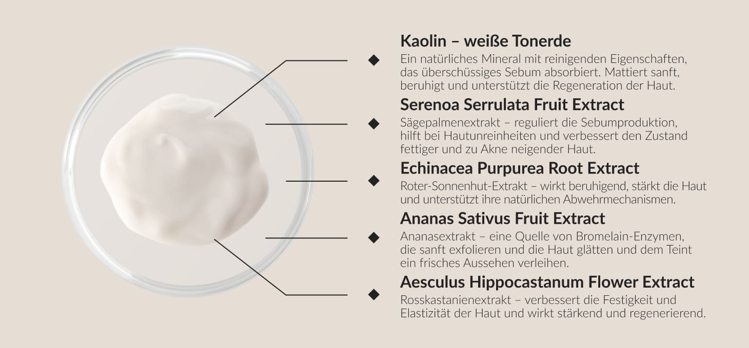 Zusammensetzung (INCI): Aqua, Glycerin, Capryl-/Capric-Triglycerid, Kaolin, Glycerylstearat, Cetearylalkohol, Propanediol, Cetylalkohol, Phenoxyethanol, Aesculus Hippocastanum-Blütenextrakt, Ananas-Sativus-Fruchtextrakt, Prunus Amygdalus Dulcis-Öl, Argania spinosa-Kernöl, Serenoa serrulata Fruchtextrakt, Echinacea purpurea-Wurzelextrakt, Beta-Sitosterol, Azelainsäure, Sesam-indicum-Samenöl, Salicylsäure, Olusöl, Panthenol, Tocopherol, Xanthan-Gummi, Propylenglykol, Ethylhexylglycerin, Natriumbenzoat, Kaliumsorbat, Parfum, Tetramethylacetyloctahydronaphthale, Hexamethylindanopyran.