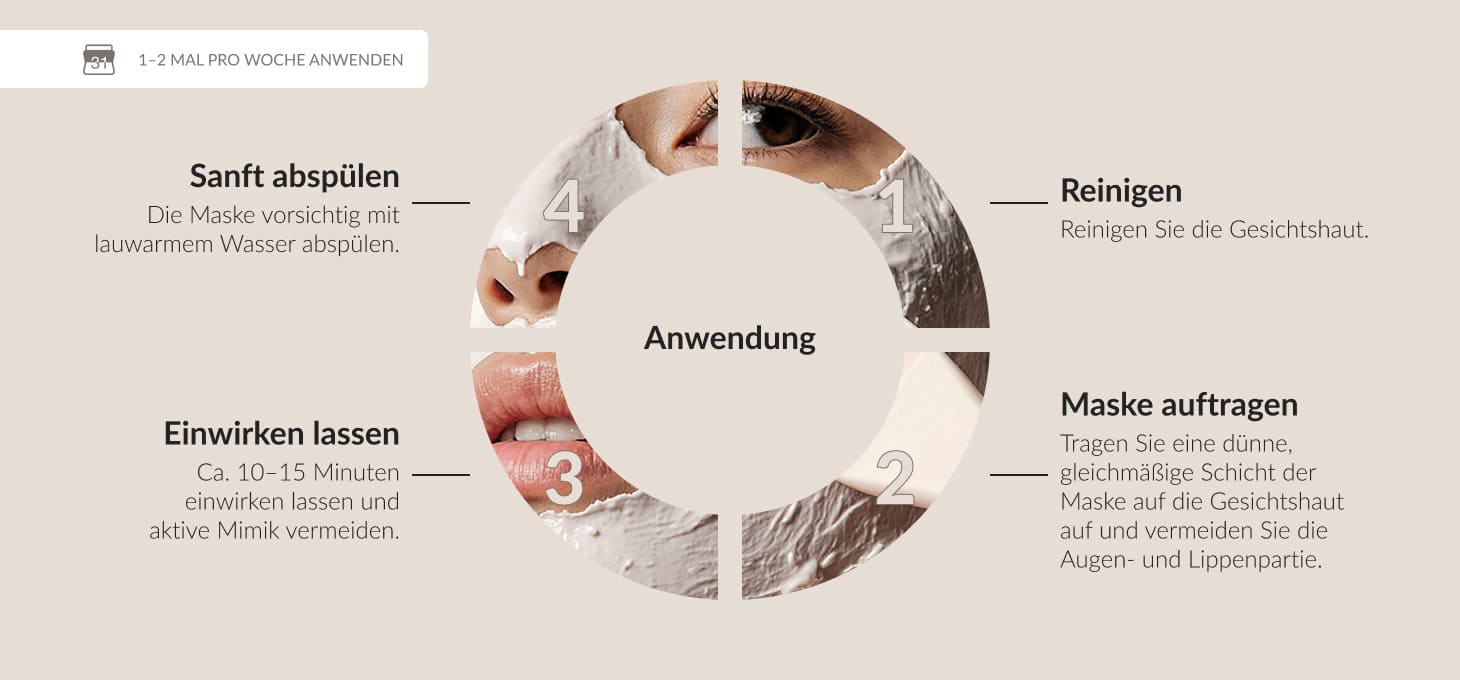 Tragen Sie eine gleichmäßige, dünne Schicht der Maske auf die gereinigte Gesichtshaut auf und vermeiden Sie dabei Augen- und Mundbereich. 10–15 Minuten einwirken lassen und dann mit lauwarmem Wasser abwaschen. Verwenden Sie 1-2 Mal pro Woche oder je nach individuellen Hautbedürfnissen.
