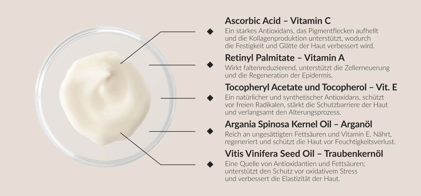 Zusammensetzung (INCI): Aqua, Vitis vinifera Samenöl, Glycerin, Capryl-/Capric-Triglycerid, Glycerylstearat, Glycerylstearat Citrat, Parfum, Phenoxyethanol, Butyrospermum Parkii-Butter, Panthenol, Tocopherylacetat, Ascorbinsäure, Retinylpalmitat, Prunus Cerasus Fruchtextrakt, Tocopherol, Argania spinosa Kernöl, Euphorbia cerifera cera, Hydroxyethylacrylat/Natriumacryloyldimethyltaurat-Copolymer, Acrylate/C10-30 Alkylacrylat-Crosspolymer, Ethylhexylglycerin, Triethanolamine, Sorbitan Isostearate, Polysorbate 60, Sodium Benzoate, Potassium Sorbate, Citronellol, Limonene, Hexyl Cinnamal.