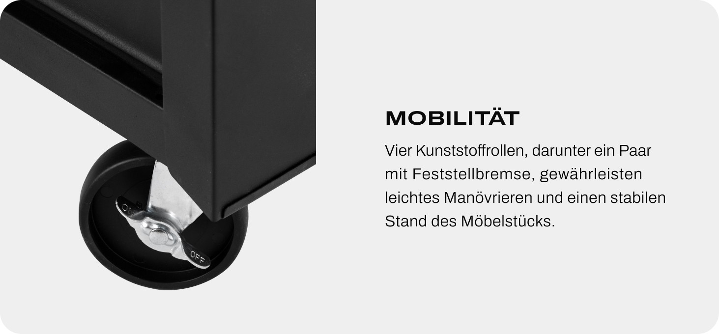 Vier helle Kunststoffrollen – ein Paar davon mit Bremse – sorgen für leichtes Fahren und stabile Positionierung. Ein seitlicher Griff erleichtert das Manövrieren im Studio.
