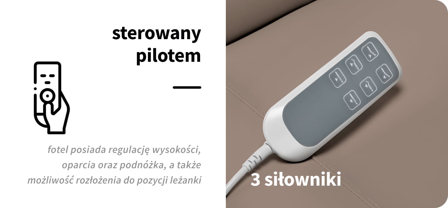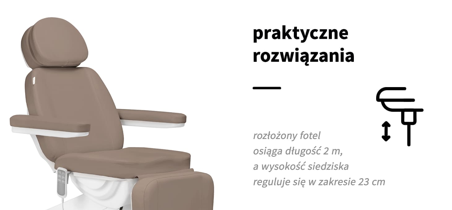Przy użyciu prostego w obsłudze pilota fotel płynnie dostosowuje się w 3 płaszczyznach – posiada regulację wysokości, oparcia oraz podnóżka. Siedzisko można ustawić tak, by znajdowało się na wysokości od 61 cm do 84 cm, a przy całkowitym rozłożeniu fotel osiąga długość 2 m. Wymiary te pozwalają na łatwe korzystanie ze sprzętu osobom o różnym wzroście i umożliwiają dostosowanie go do aktualnie wykonywanego zabiegu oraz indywidualnych potrzeb, co wpływa zarówno na komfort użytkownika, jak i osoby wykonującej usługi. Uchwyty znajdujące się po obu stronach siedziska pozwalają na odwieszenie pilota tak, by znajdował się zawsze pod ręką.