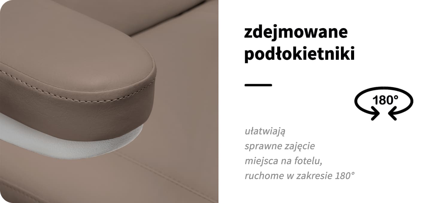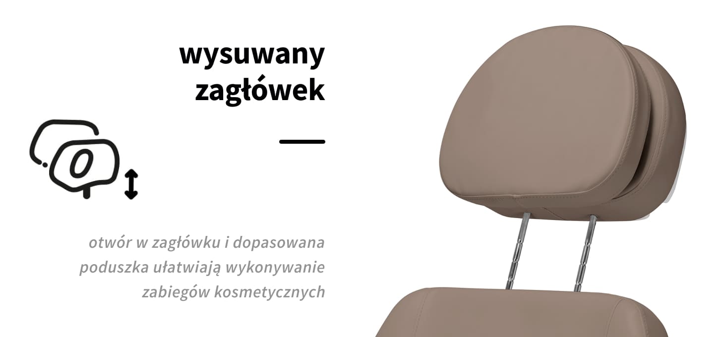 Wysuwany zagłówek pomaga dostosować sprzęt do potrzeb użytkowników o różnym wzroście, zapewniając stabilne wsparcie głowy w trakcie zabiegów. Możliwe jest również dostosowywanie wysunięcia podnóżka, co sprawdzi się zwłaszcza w trakcie zabiegów wykonywanych na wyższych osobach, zapewniając im lepsze podparcie. Podłokietniki są ruchome w zakresie 180º, dzięki czemu ułatwiają sprawne zajęcie miejsca na fotelu i zapewniają komfortowy dostęp osobie wykonującej zabieg. W razie potrzeby możliwy jest łatwy i szybki ich demontaż.