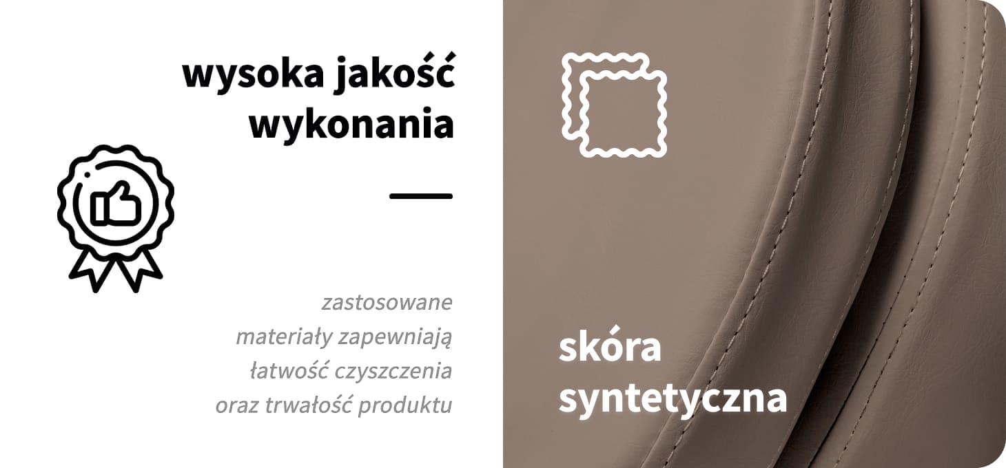 Fotel wypełniony jest wyprofilowaną pianką i pokryty przyjemną w dotyku skórą syntetyczną w odcieniach brązu. Użyty materiał sprawia, że sprzęt jest łatwy w czyszczeniu, a także odporny na wilgoć i wybrane środki dezynfekcji. Solidna podstawa wykonana z trwałego materiału w odcieniach bieli zapewnia stabilność w trakcie zabiegów. Odpowiednio wyprofilowane obszycia nadają fotelowi stylowy wygląd i sprawiają, że siedzisko jest ergonomiczne. Minimalistyczny, prosty design i klasyczna kolorystyka pozwalają mu wpasować się w każde wnętrze.