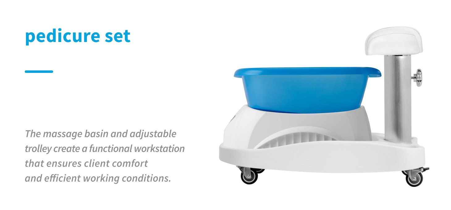 The professional Azzurro pedicure set includes a foot spa with massage function and an adjustable trolley, creating a complete workstation for beauty and podiatry clinics. A well-thought-out design enhances client comfort while ensuring mobility and working comfort for the specialist.