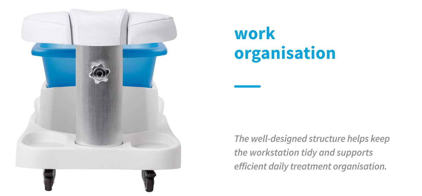 The trolley and foot spa form a durable set, designed for everyday use in podiatry clinics. The elegant white colour scheme emphasizes the modern and professional character of the pedicure workstation.