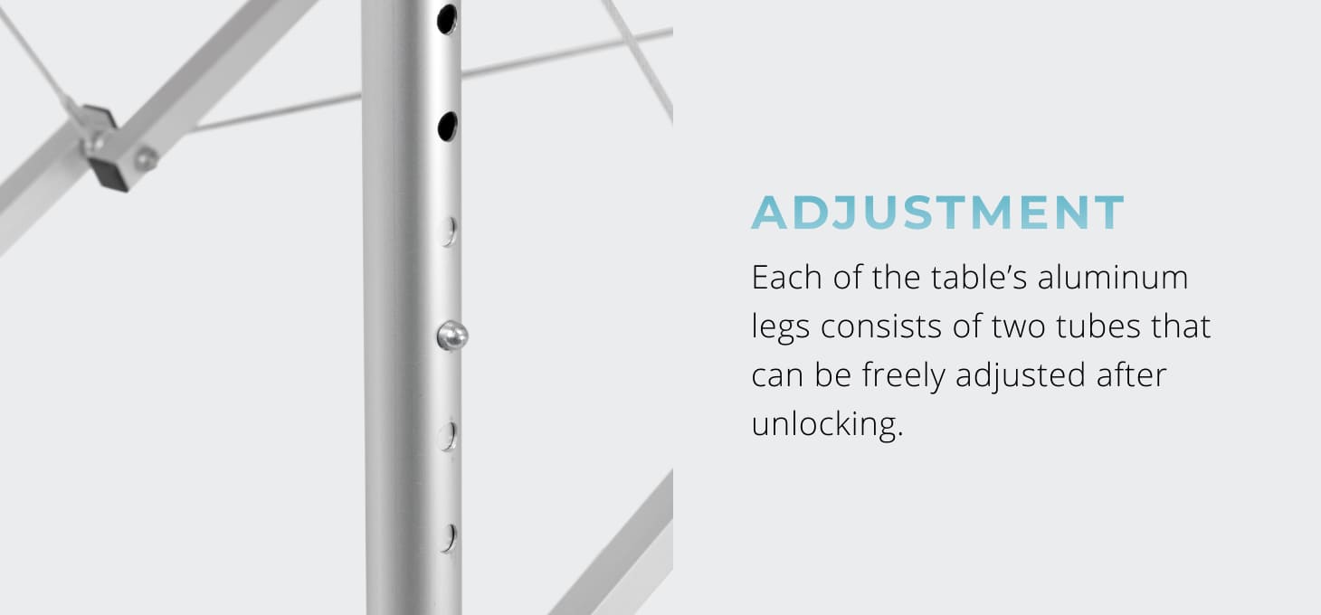 The height of the table can be adjusted to the height and individual needs of the person performing the treatment using a telescopic adjustment from 58 to 80 cm with a locking mechanism. Each of the table's aluminum legs consists of two tubes that can be freely moved relative to each other after being unlocked. The Fast Lock mechanism holds the elements in the selected position once the lock is placed in the appropriate hole. Additionally, the frame structure is stabilized with metal cables, which makes the massage table solid and perfect for a wide range of services.
