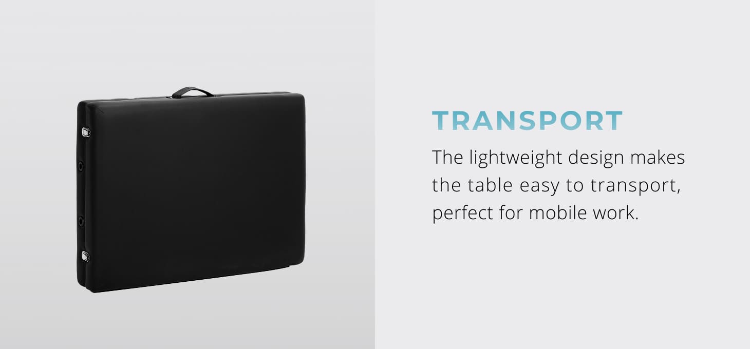 The lightweight construction makes it easy to carry, making the table an ideal choice for mobile work. The BALANCE model folds and unfolds quickly and effortlessly, and takes up little space when folded. There are straps under the table top to secure accessories for transport, allow the table to be conveniently repositioned at any time. The set also includes a dedicated transport bag with a shoulder strap and a handle – it protects the table from dirt and damage, ensuring comfortable movement.