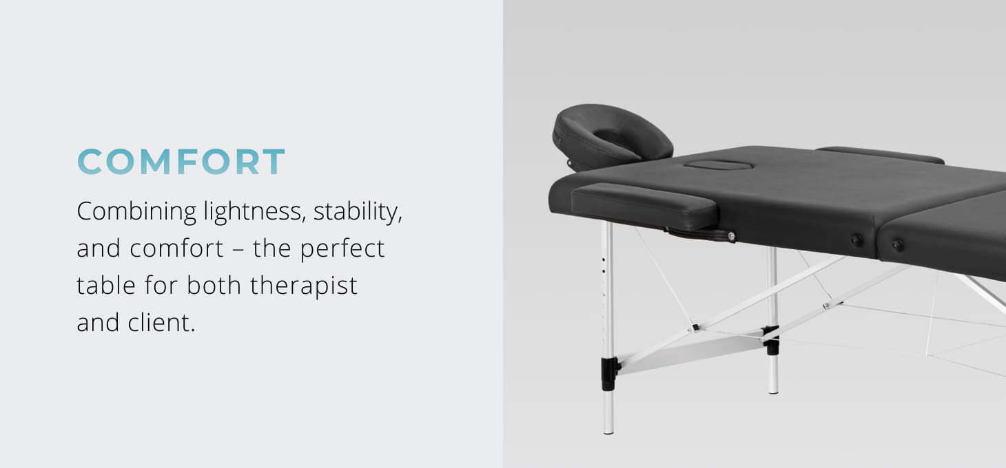The BALANCE massage table has been designed with comfort and durability in mind. Soft imitation leather upholstery and a foam filling with optimum firmness ensure comfort during treatments. The materials are resistant to moisture, easy to clean and durable, which makes the table perfect for everyday work. The aluminum legs increase the stability of the structure, and thanks to its resistance to moisture, the table can also be safely used in places such as fitness clubs or locker rooms.