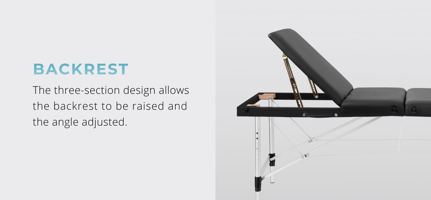 The three-segment table design allows you one of the segments to be lifted to act as a backrest. The angle adjustment allows the patient to be comfortably positioned in a semi-sitting or sitting position, which is particularly useful for therapies that require repositioning, reflexology or cosmetic treatments. The solid support mechanism ensures stability and safety, and the possibility of adjustment increases the table's functionality and allows it to be better suited to the specific services performed.