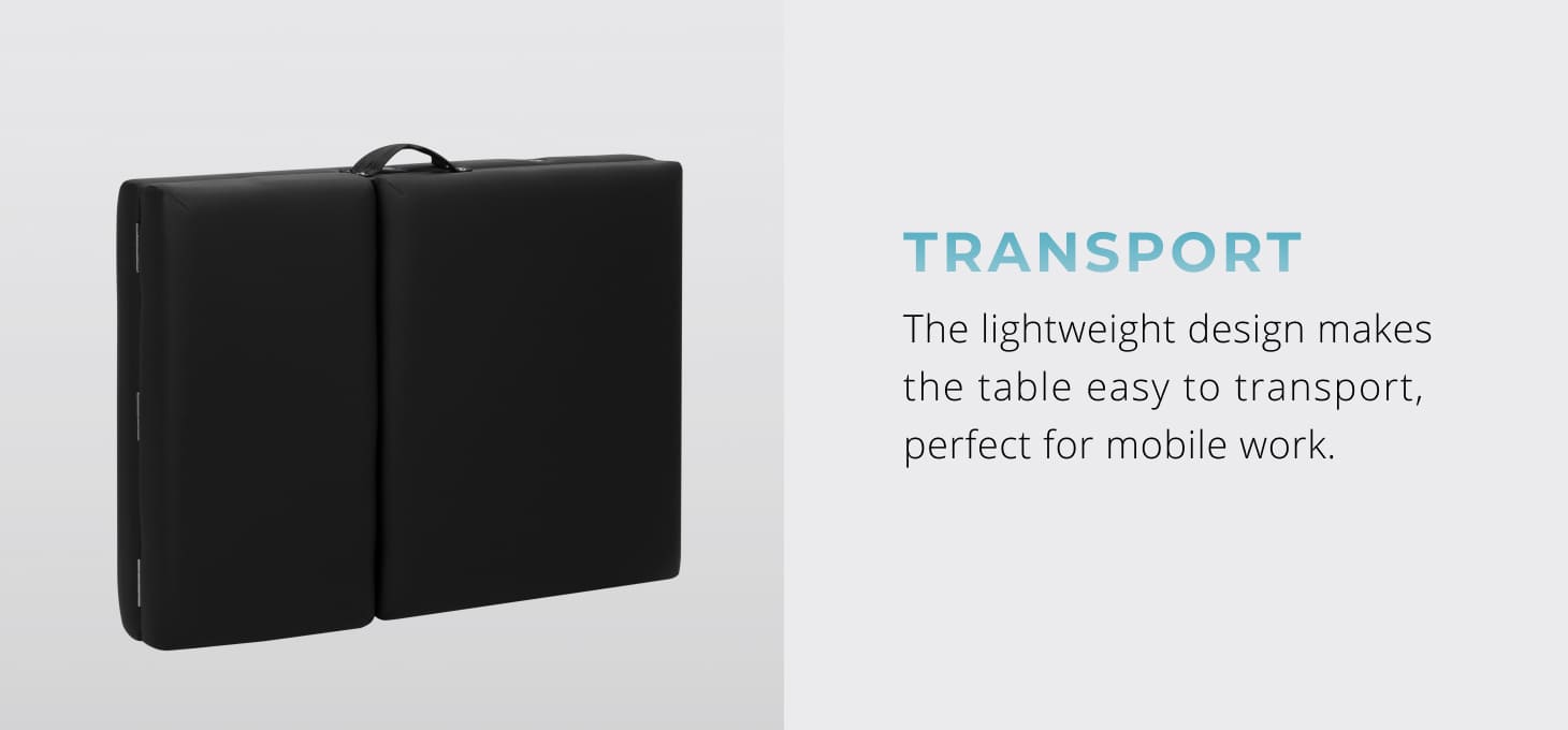 The lightweight construction makes it easy to carry, making the table an ideal choice for mobile work. The BALANCE model folds and unfolds quickly and effortlessly, and takes up little space when folded. There are straps under the table top to secure accessories for transport, allow the table to be conveniently repositioned at any time. The set also includes a dedicated transport bag with a shoulder strap and a handle – it protects the table from dirt and damage, ensuring comfortable movement.