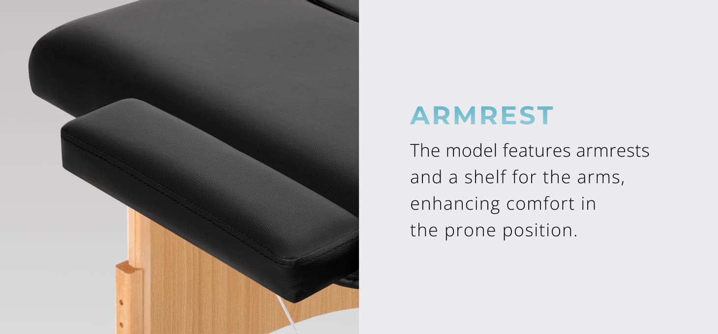 Regardless of the type of treatment performed or the position adopted by the patient, the correct positioning of the hands is essential – ensuring relaxation without hindering the therapist's work. This model is equipped with easy-to-install armrests and an additional shelf under the arms, irreplaceable when the patient is positioned on the abdomen. These solutions increase the functionality of the table and guarantee high comfort for the person receiving treatment.