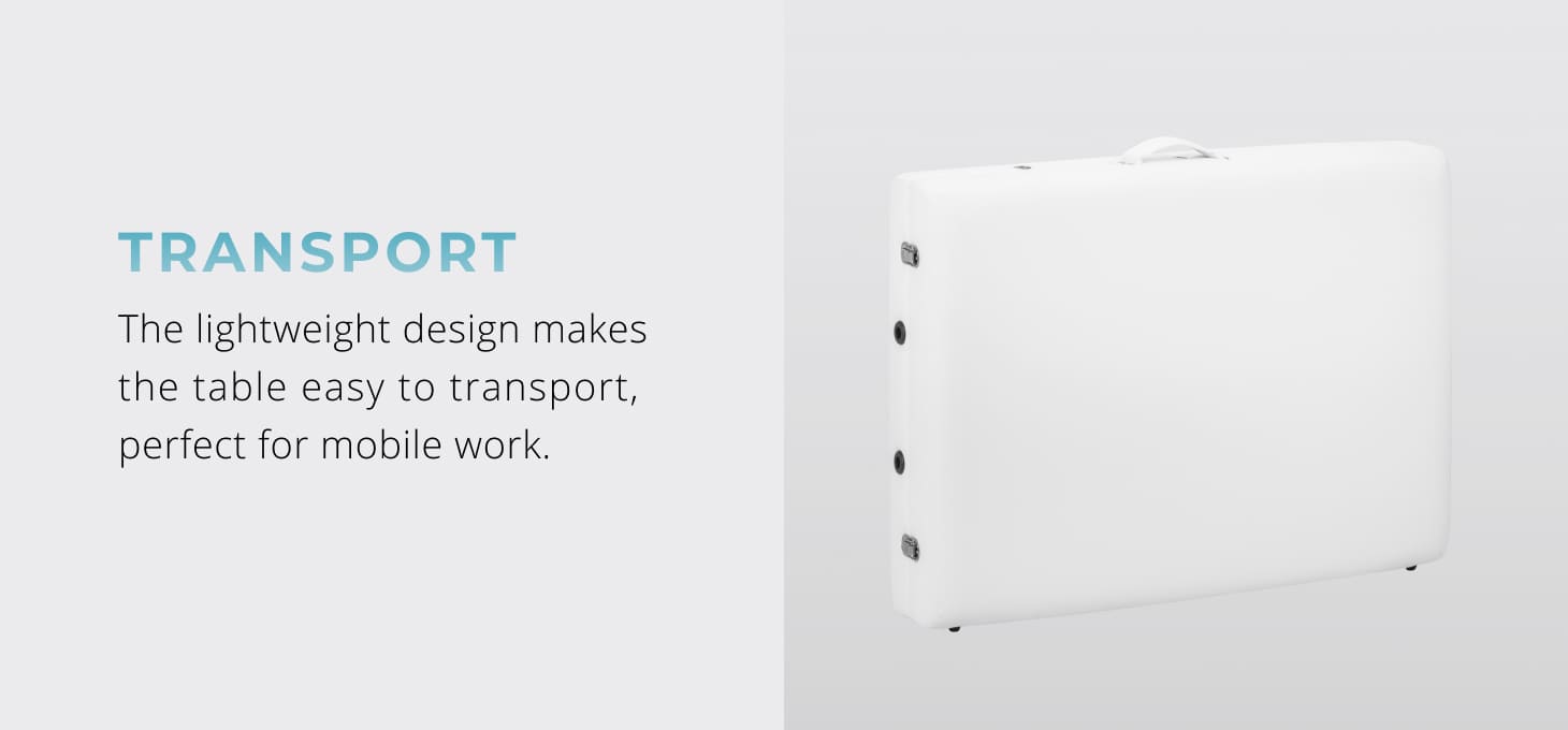The lightweight construction makes it easy to carry, making the table an ideal choice for mobile work. The BALANCE model folds and unfolds quickly and effortlessly, and takes up little space when folded. There are straps under the table top to secure accessories for transport, allow the table to be conveniently repositioned at any time. The set also includes a dedicated transport bag with a shoulder strap and a handle – it protects the table from dirt and damage, ensuring comfortable movement.