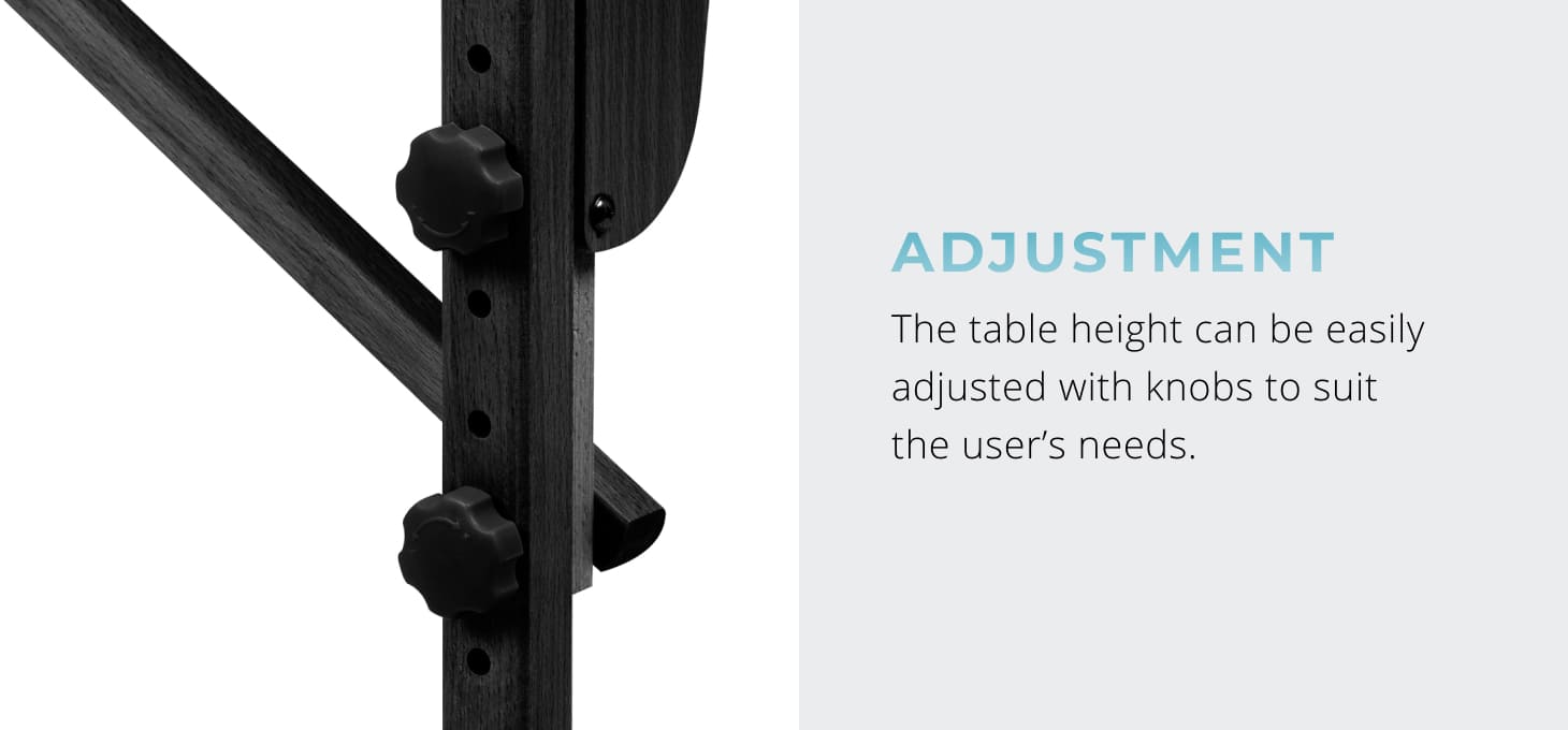The table height can be adapted to the height and individual needs of the person performing the treatment using the knobs located on the table legs within the range of 62–92 cm. Each leg consists of two matching elements, and once the desired height is selected, simply screw the parts into the appropriate holes to ensure the table remains stable. Additionally, the frame construction is reinforced with metal cables, making the massage table solid and perfectly suited for a wide range of treatments.