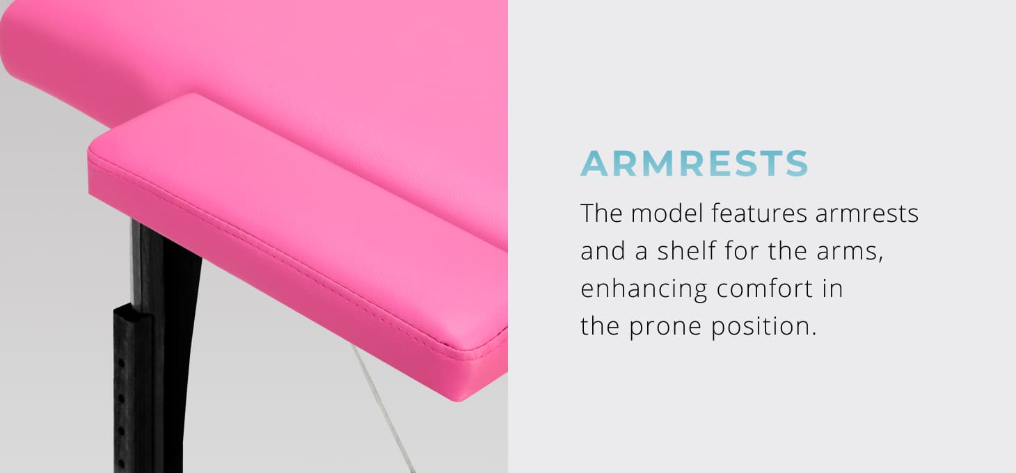 Regardless of the type of treatment performed or the position adopted by the patient, the correct positioning of the hands is essential – ensuring relaxation without hindering the therapist's work. This model is equipped with easy-to-install armrests and an additional shelf under the arms, irreplaceable when the patient is positioned on the abdomen. These solutions increase the functionality of the table and guarantee high comfort for the person receiving treatment.