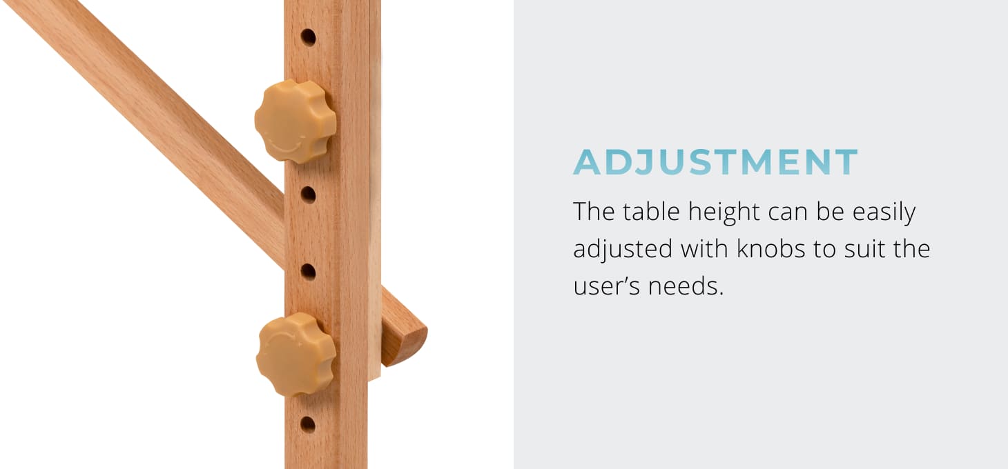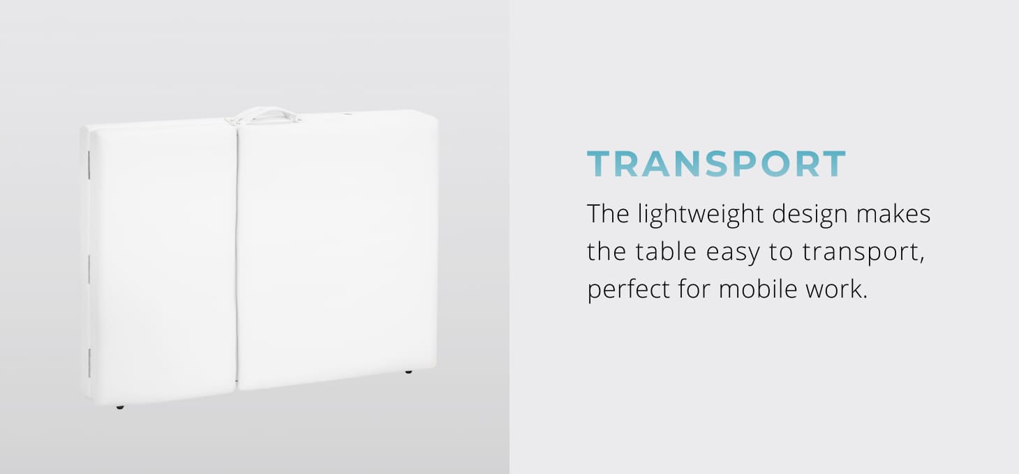 The lightweight construction makes it easy to carry, making the table an ideal choice for mobile work. The BALANCE model folds and unfolds quickly and effortlessly, and takes up little space when folded. There are straps under the table top to secure accessories for transport, allow the table to be conveniently repositioned at any time. The set also includes a dedicated transport bag with a shoulder strap and a handle – it protects the table from dirt and damage, ensuring comfortable movement.