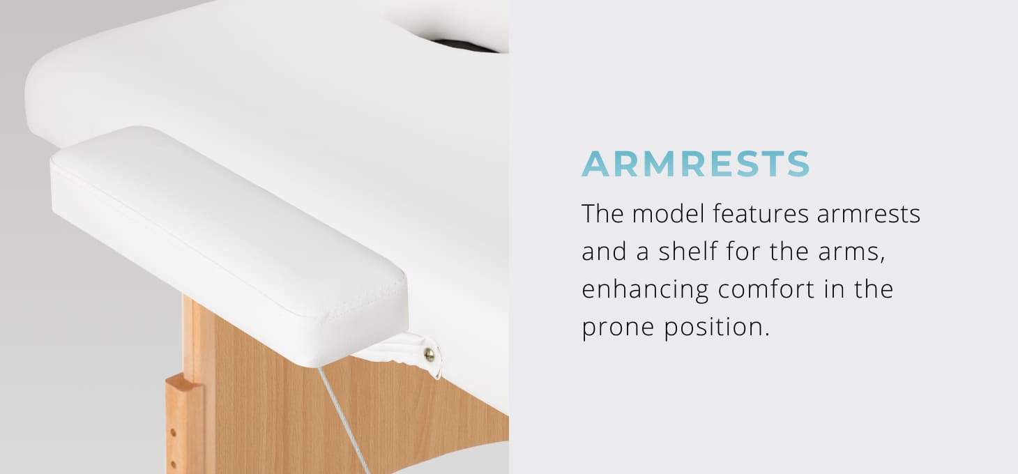 Regardless of the type of treatment performed or the position adopted by the patient, the correct positioning of the hands is essential – ensuring relaxation without hindering the therapist's work. This model is equipped with easy-to-install armrests and an additional shelf under the arms, irreplaceable when the patient is positioned on the abdomen. These solutions increase the functionality of the table and guarantee high comfort for the person receiving treatment.