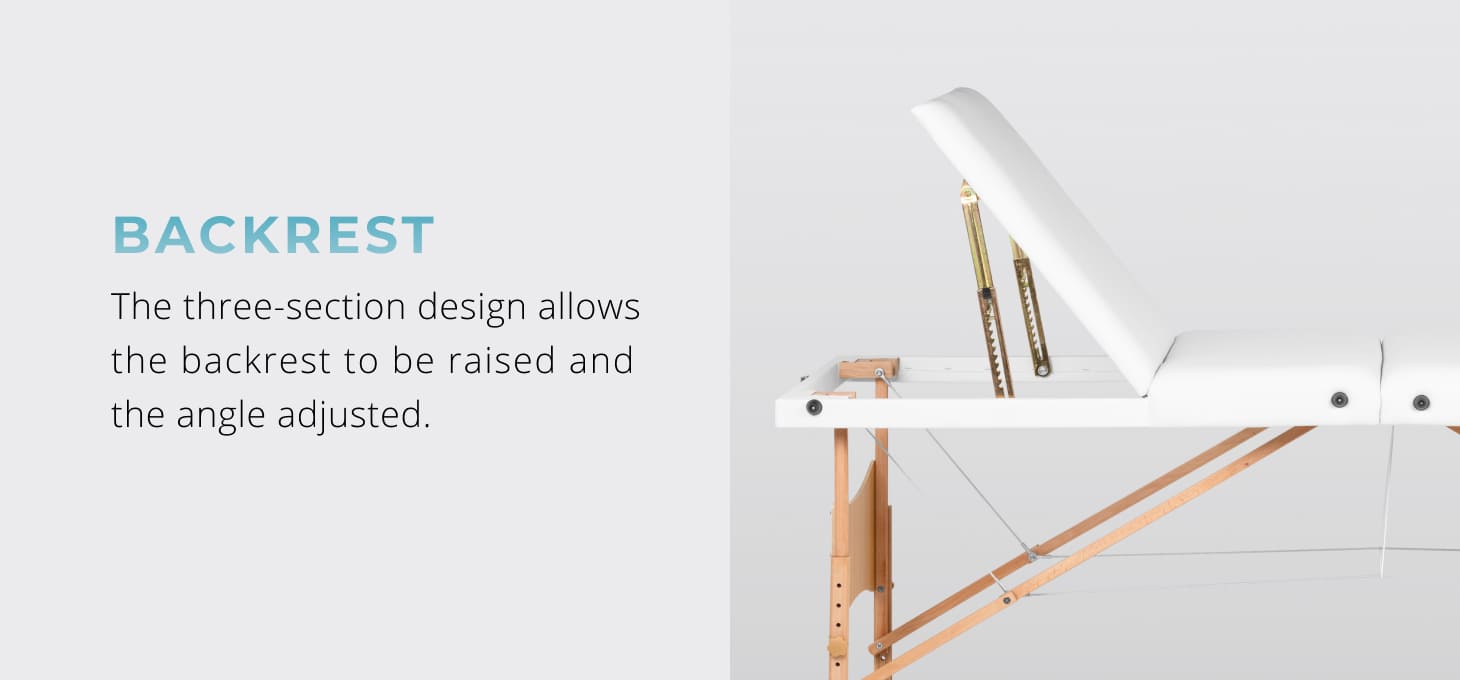 The three-segment table design allows you one of the segments to be lifted to act as a backrest. The angle adjustment allows the patient to be comfortably positioned in a semi-sitting or sitting position, which is particularly useful for therapies that require repositioning, reflexology or cosmetic treatments. The solid support mechanism ensures stability and safety, and the possibility of adjustment increases the table's functionality and allows it to be better suited to the specific services performed.