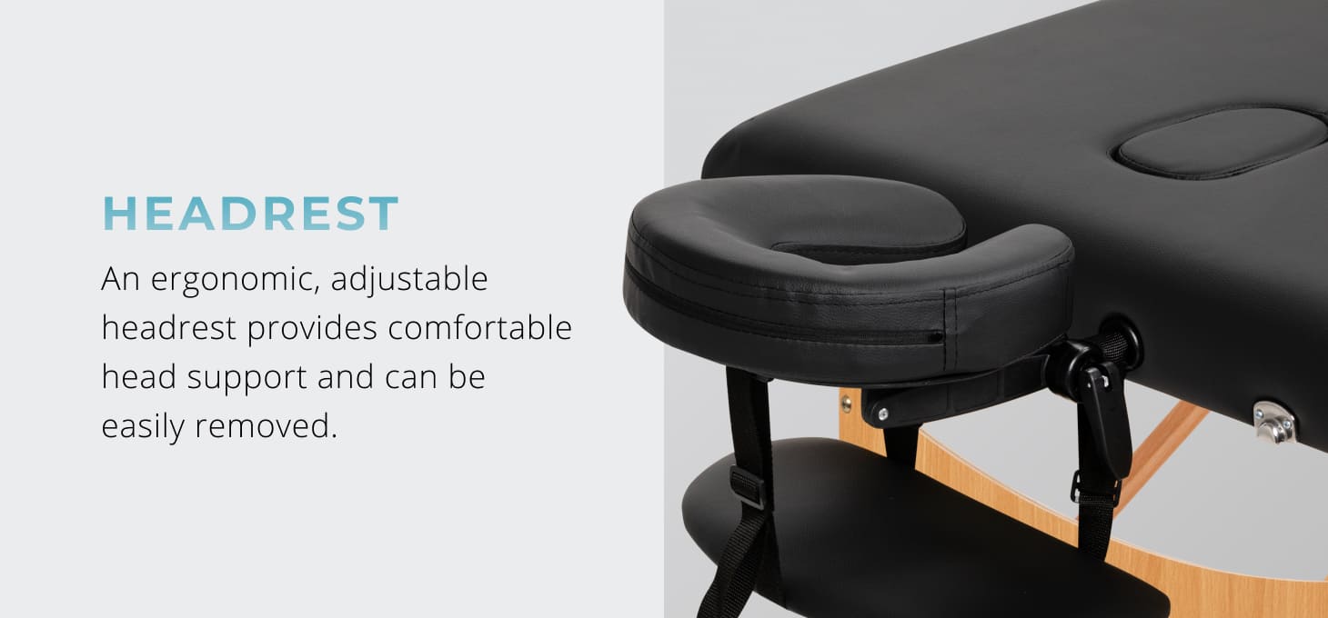 To ensure maximum comfort, the person using the table can rest their head on the ergonomic headrest, which is included in the set. This element is easy to adjust – it allows the angle to be adjusted in two planes, which makes it possible to precisely adjust its position to the user's needs and the nature of the treatment being performed. For supine therapy, the headrest can be removed, using a special hole in the tabletop instead. When not in use, the hole can be covered with the included plug, restoring the surface to an aesthetic and uniform appearance.