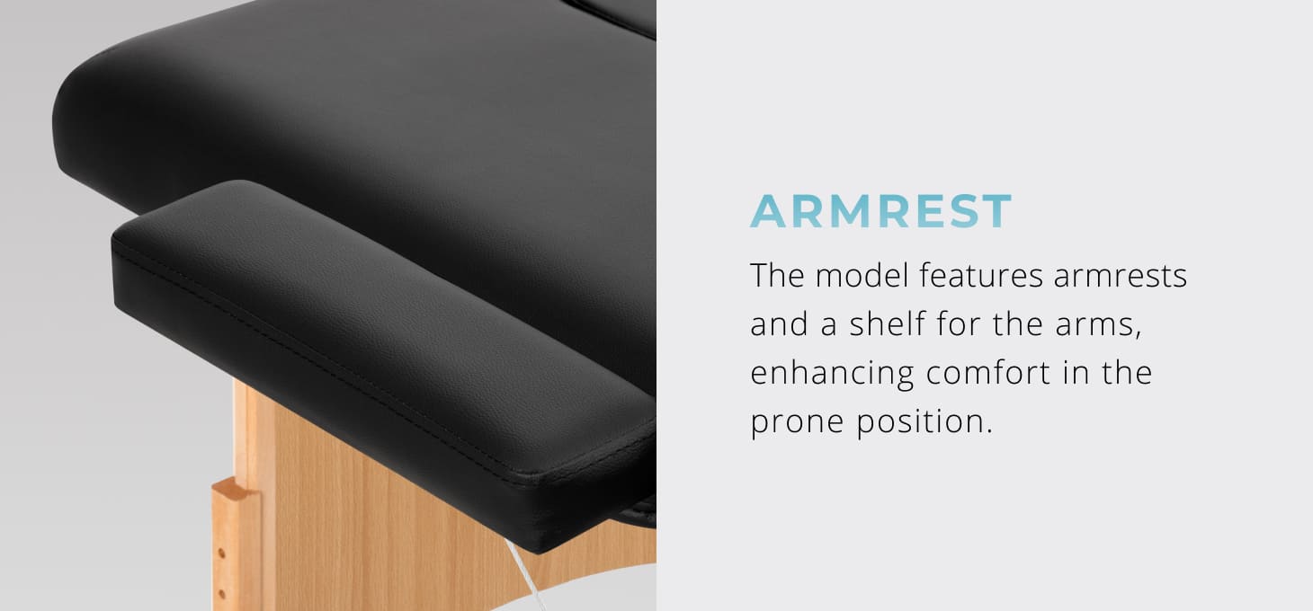 Regardless of the type of treatment performed or the position adopted by the patient, the correct positioning of the hands is essential – ensuring relaxation without hindering the therapist's work. This model is equipped with easy-to-install armrests and an additional shelf under the arms, irreplaceable when the patient is positioned on the abdomen. These solutions increase the functionality of the table and guarantee high comfort for the person receiving treatment.