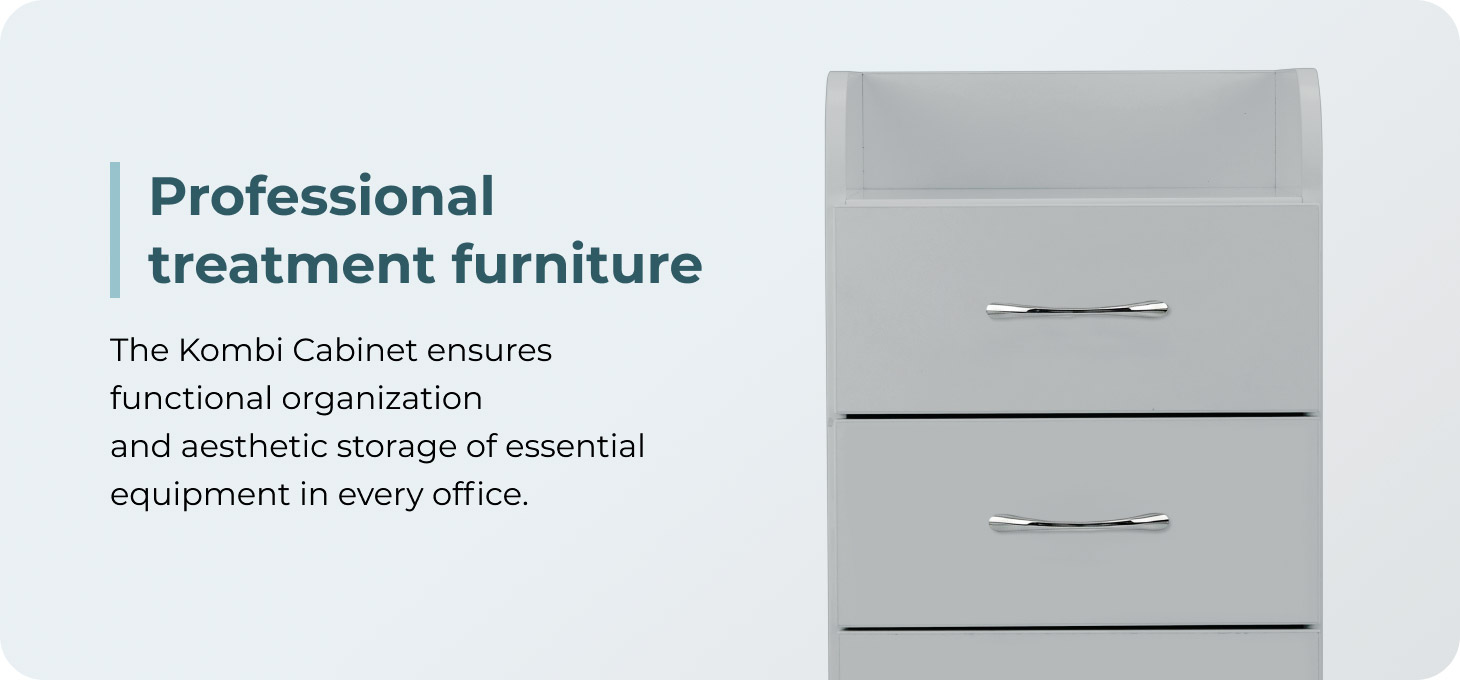 The Kombi cabinet is a functional and aesthetic piece of equipment for beauty salons, podiatry clinics and other treatment rooms. Its well-thought-out design ensures convenient organisation and allows for the proper storage of equipment, cosmetics and essential accessories and tools. The product adds elegance and helps to maintain order in everyday work.