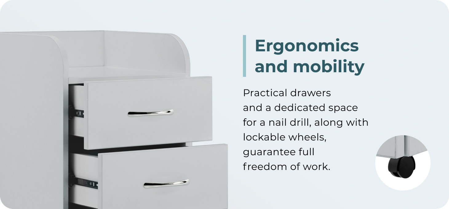 Three drawers of various sizes allow for convenient organisation of accessories, tools and cosmetic products. The mobility of the furniture is ensured by practical castors, including two with brakes, which facilitate moving the cabinet and allow it to be placed stably in the desired location. The design, created with podiatry clinics in mind, includes a dedicated space for a podiatry drill with an absorber, which promotes ergonomic organisation of the workstation and increases the comfort of performing treatments.
