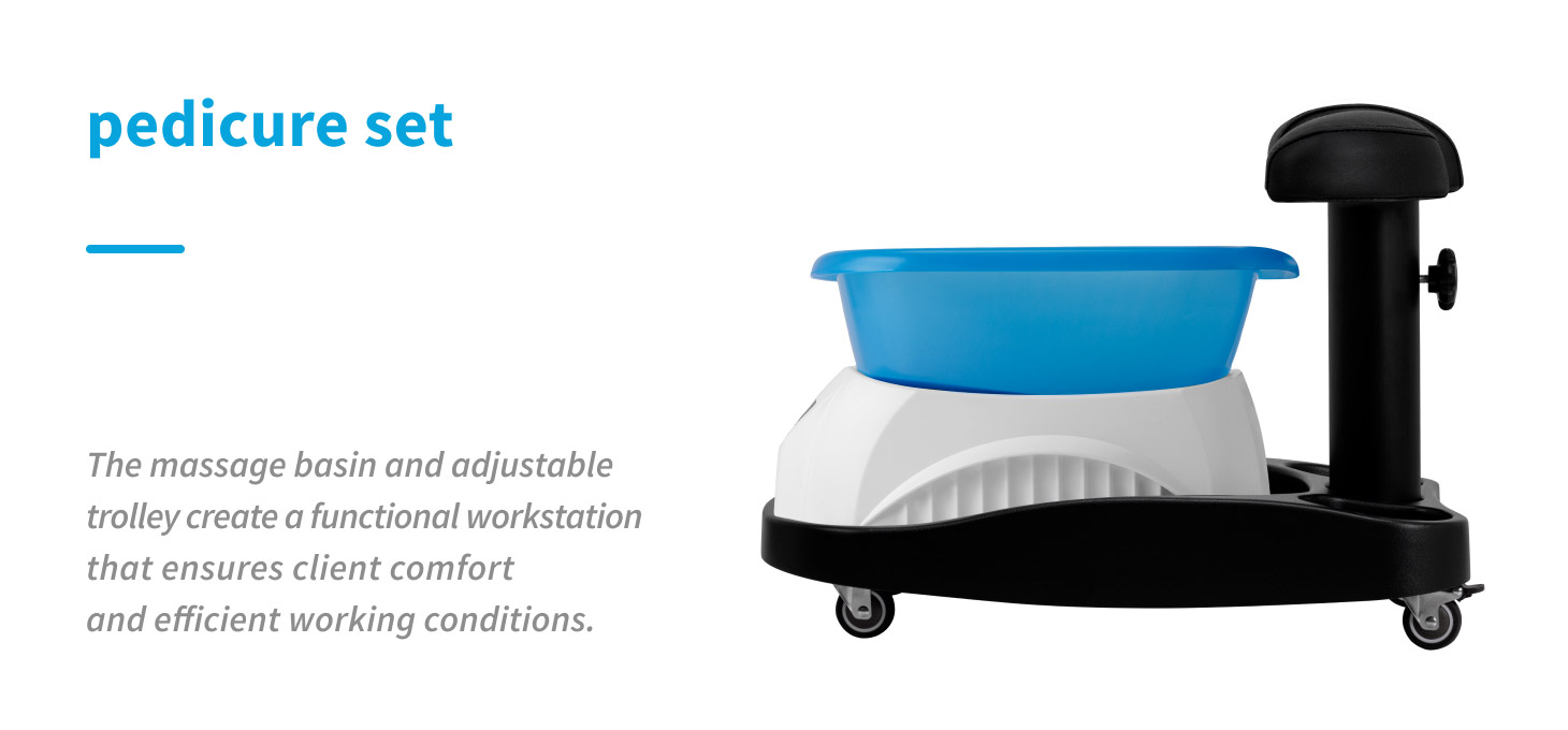 The professional Azzurro pedicure set includes a foot spa with massage function and an adjustable trolley, creating a complete workstation for beauty and podiatry clinics. A well-thought-out design enhances client comfort while ensuring mobility and working comfort for the specialist.