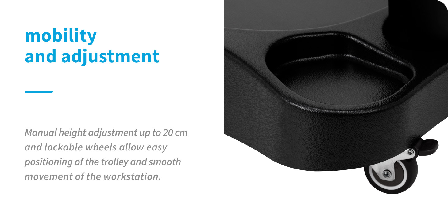The adjustable trolley with footrest allows positioning to be adapted to the needs of both the client and the practitioner. Manual height adjustment up to 20 cm, moisture-resistant synthetic leather upholstery, and stable rubber wheels with locks ensure comfort, mobility, and good workstation organization.