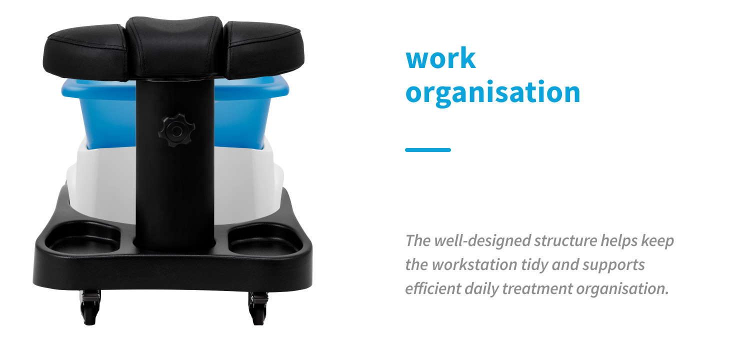 The trolley and foot spa form a durable set, designed for everyday use in podiatry clinics. The elegant black colour scheme emphasizes the modern and professional character of the pedicure workstation.