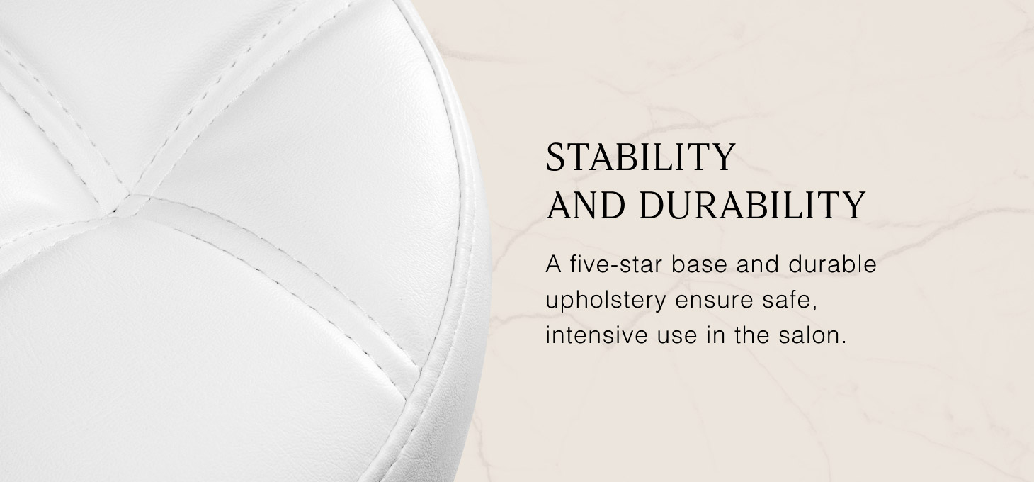 The five-star base ensures stability and safety of use, even with frequent changes of position. Rubberised castors allow you to move freely around the room. The durable synthetic leather upholstery in shades of white is resistant and easy to keep clean. Decorative quilting adds elegance and emphasises the professional character of the stool.