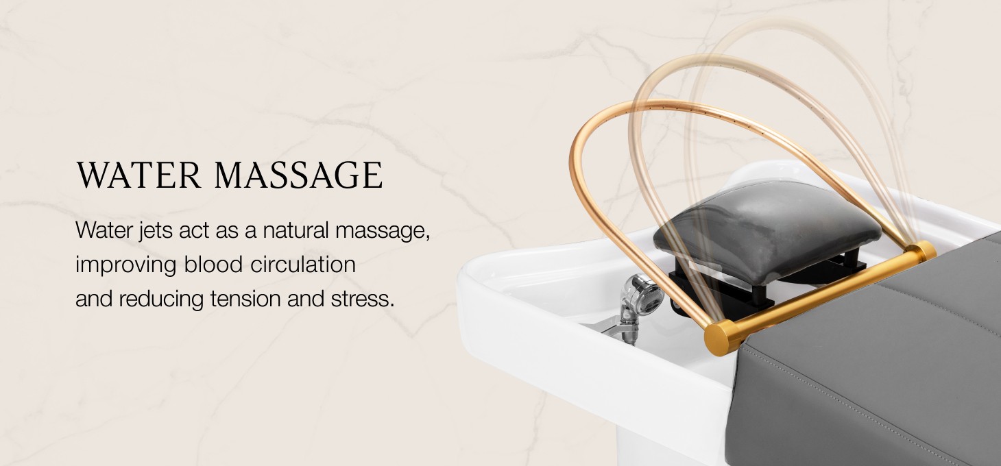 The golden arc with an adjustable angle of inclination, designed for the Waterfall Head SPA, is an innovative solution that allows for holistic care of the scalp. The water jets act as a natural massage, improving blood circulation, reducing tension and stress. The precisely controlled water flows support hair regeneration and intensively moisturise the skin. The waterfall arc with the possibility of adjusting the angle ensures deep cleansing of the scalp and relaxation, bringing relief from ailments such as headaches or stiff neck. Thanks to an intelligent closed-loop system, the arc draws water from the bowl and reuses it, providing an uninterrupted water massage. This is a combination of technology and relaxation that supports hair health and well-being