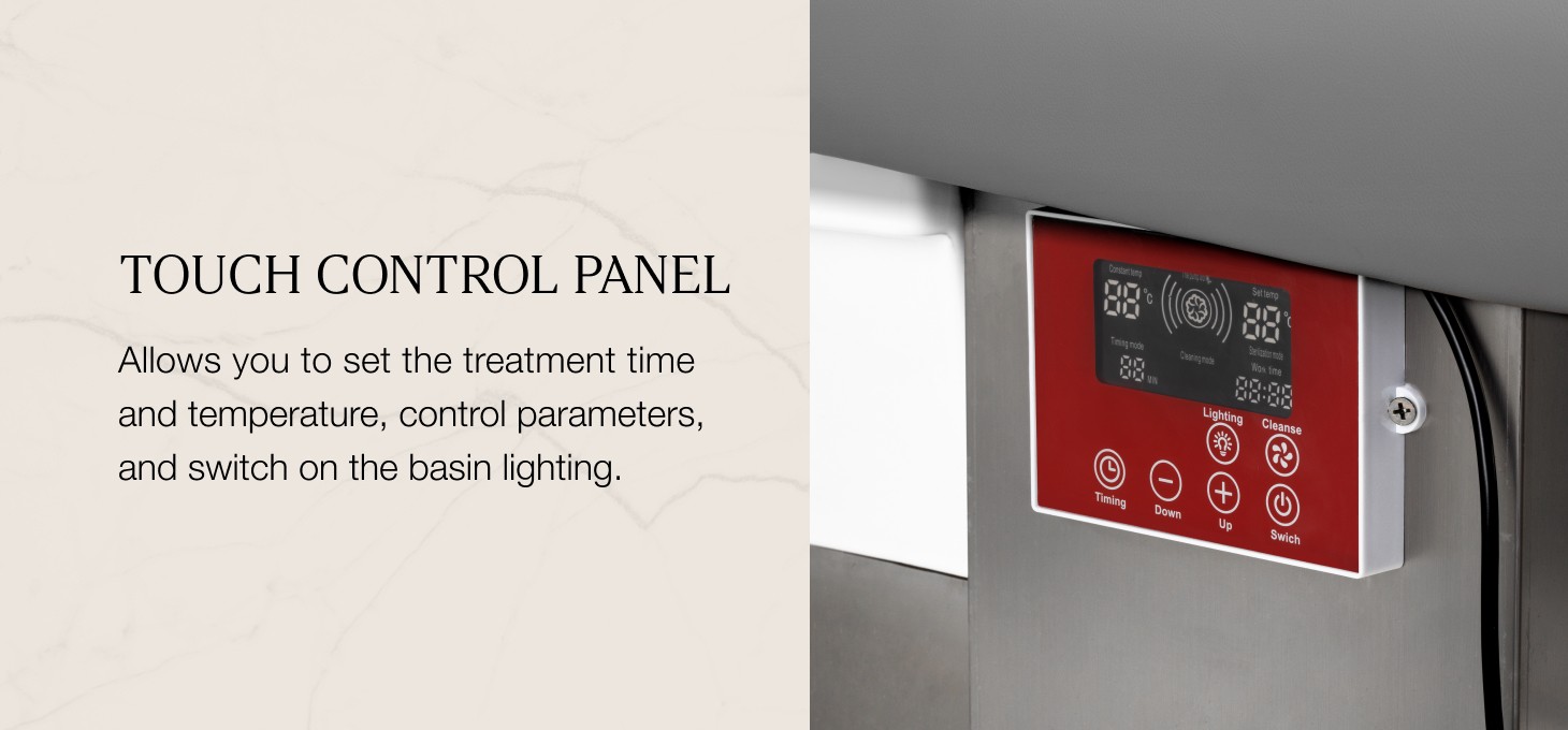 The intuitive touch panel provides full control over the wash unit functions. It allows you to adjust the operating time and water temperature, as well as monitor their current values. Thanks to the built-in display, you can check how long the device has been working at any time. The panel also allows you to activation of the light therapy function, i.e. illumination of the bowl, creating an atmosphere of relaxation and luxury. Additionally, the steam therapy device is equipped with a remote control, enabling convenient remote operation.