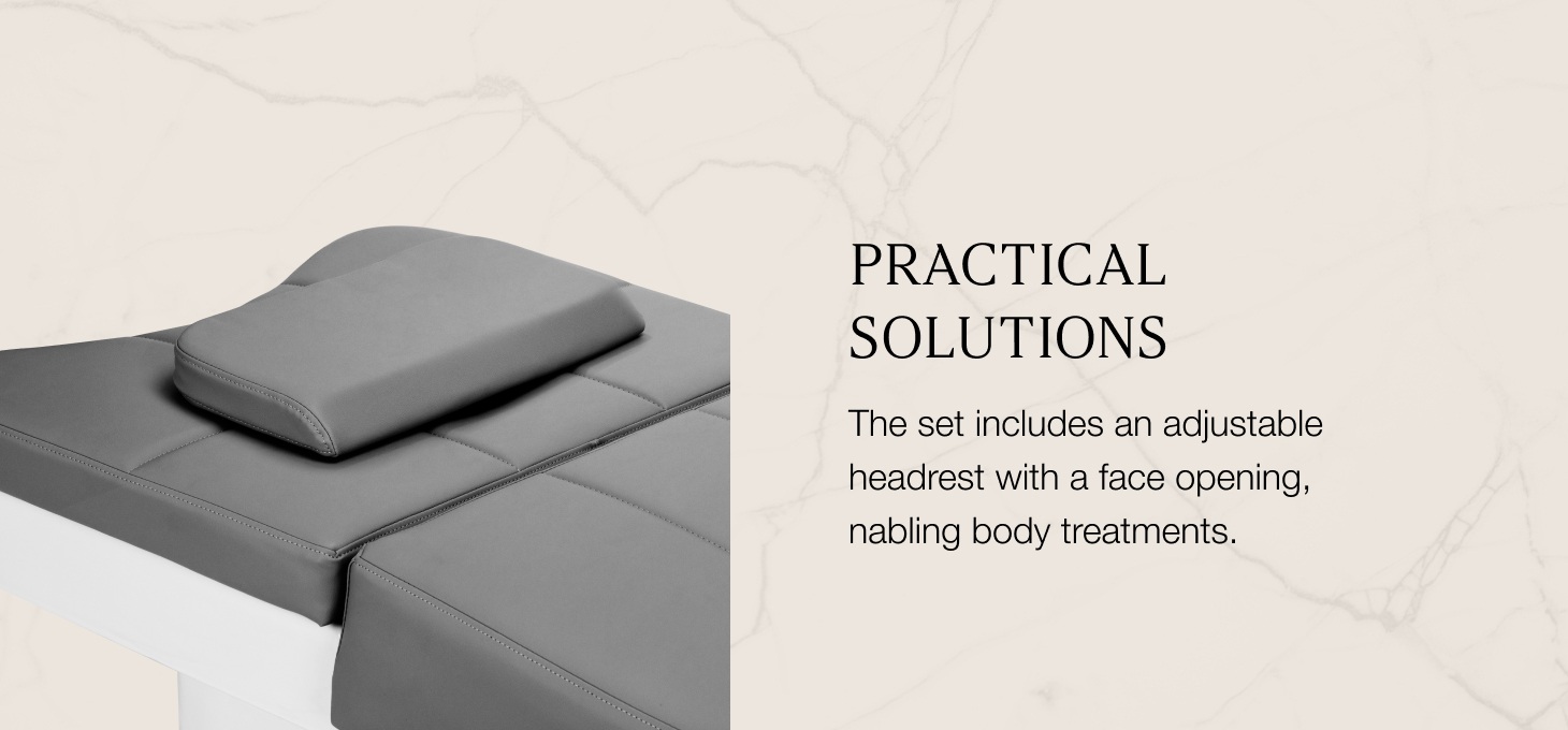 The adjustable headrest with the possibility of extending and changing the angle of inclination ensures a perfect fit to the user's needs, increasing comfort during treatments. The set also includes ergonomic pillows, including a headrest with an opening for the face, which allows you to perform not only scalp care procedures, but also massages and various body and face treatments. With these practical solutions, the lounger becomes a versatile element of beauty & wellness salon equipment, guaranteeing comfort and effectiveness of any therapy.