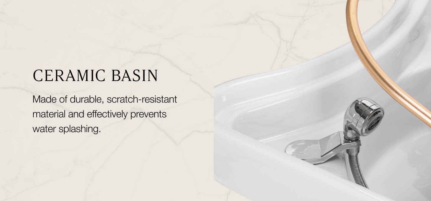The deep ceramic bowl in shades of white effectively prevents splashing of water and products used during treatments, ensuring cleanliness and comfort of work. Its unique bend not only facilitates access for the practicioner, but also adds an elegant, modern character to the wash unit. Made of durable material, the bowl is resistant to discoloration, scratches and damage, and its smooth surface makes keeping it clean exceptionally easy. The combination of functionality and aesthetics raises the standard of any professional space.