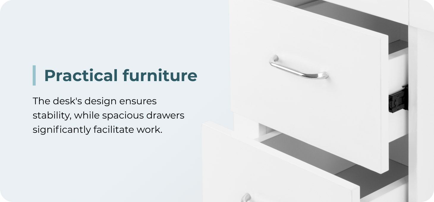Cabinets on both sides with three capacious drawers make it much easier to organize and keep the most necessary cosmetics and tools in order. Thanks to this, the necessary products are always at hand, which translates into work efficiency. The desk has special holes in the tabletop for routing cables from necessary devices, which allows you to easily maintain order and aesthetics of the workstation.