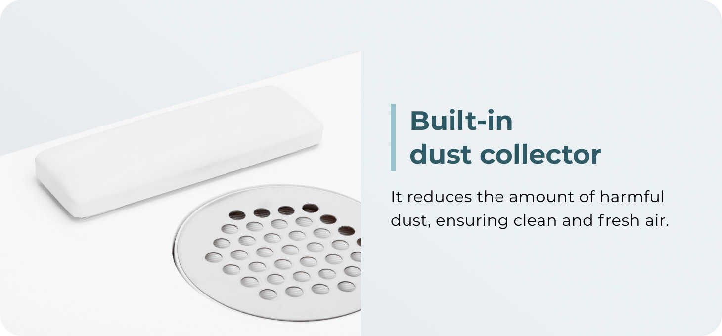 The innovative cassette dust absorber built into the countertop significantly improves working comfort and hygiene, effectively removing dust generated during cosmetic treatments, such as manicure. Thanks to this device, the air in the salon remains clean and the workplace free from pollution, which increases safety for both the beautician and the clients. The dust collector is easy to use and maintain, which further increases its functionality. It is possible to purchase a replacement cartridge filter for the absorber (SKU 132085).