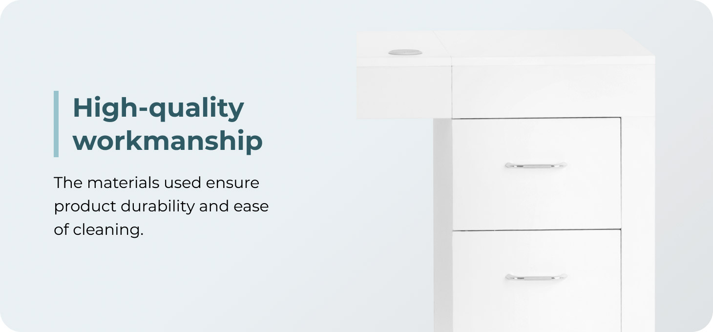 The aesthetic appearance gives timeless elegance to the desk, which is a perfect addition to any professional interior. The high-quality materials used give the furniture a modern look, while ensuring durability and ease of cleaning. The minimalist form makes the desk not only easier to store products and accessories, but also an aesthetic element that emphasizes the simplicity and elegance of the space of beauty salons.
