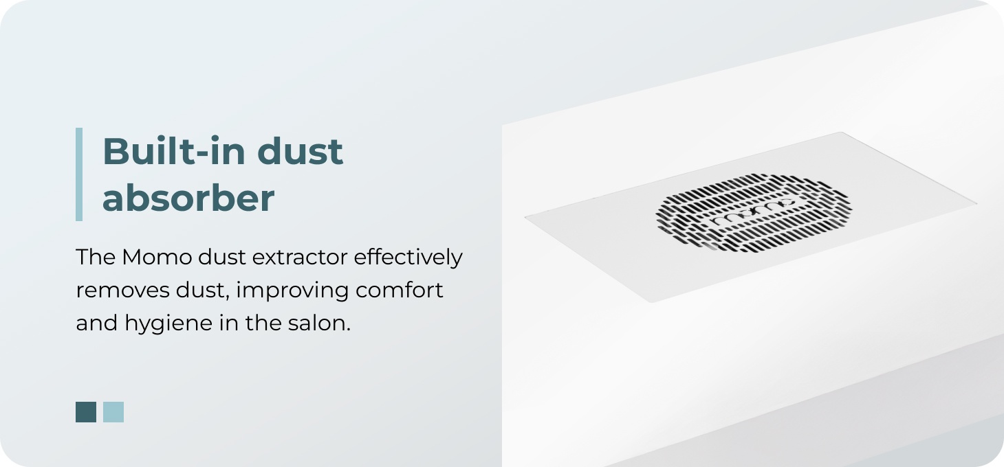The Momo J-02 cassette dust absorber built into the countertop significantly improves comfort and hygiene, effectively removing dust generated during cosmetic treatments such as manicures. With this device, the air in the salon remains clean and the work area remains free of contamination, increasing safety for both the beautician and clients. The dust absorber is easy to use and maintain, further enhancing its functionality. Regular cleaning and filter replacement ensure consistently high absorption efficiency. Additional replacement filters can be purchased (SKU 123581).