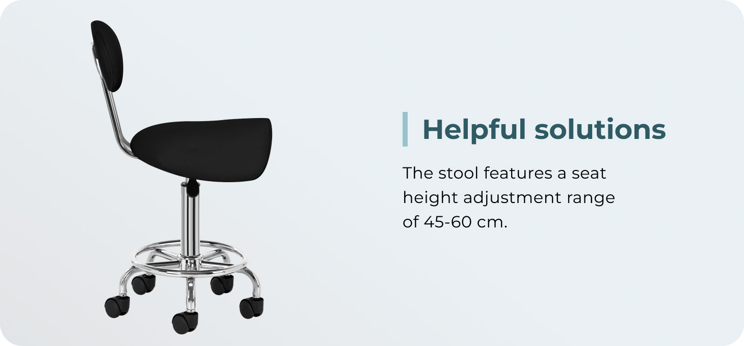 The ability to adjust the seat height in the range of 49-62 cm makes it easier for the specialist to properly position the body while performing services. The seat profiled in the shape of a saddle filled with durable, deformation-resistant foam guarantees users comfort and ergonomics of work. The comfortable backrest provides excellent back support, regardless of the user's height. The full rotation mechanism makes work more effective and comfortable.